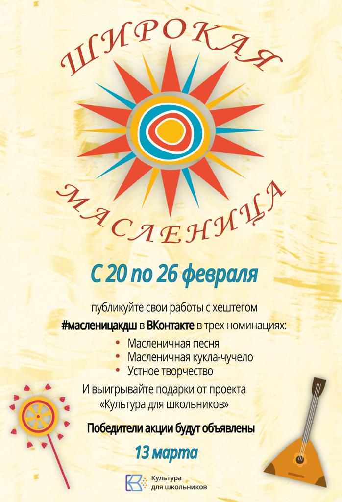В рамках межведомственного культурно-образовательного проекта Минкультуры и Минпросвещения России «Культура для школьников» в период с 20 по 26 февраля 2023 года состоится Всероссийская акция «Широкая Масленица», направленная на популяризацию традиционной культуры народов России.