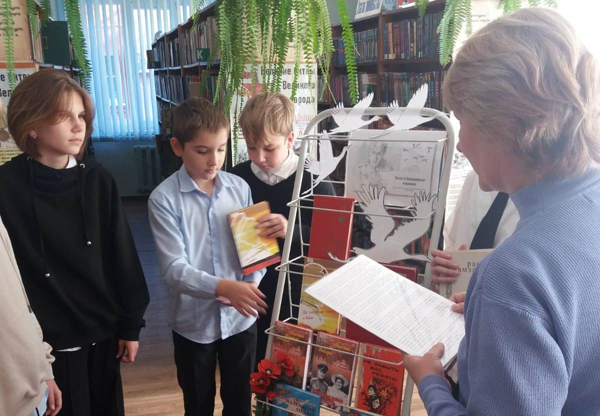 Для читателей была подготовлена обзорная выставка «День белых журавлей», на которой были представлены стихи Расула Гамзатова, рассказы о Великой Отечественной войне.