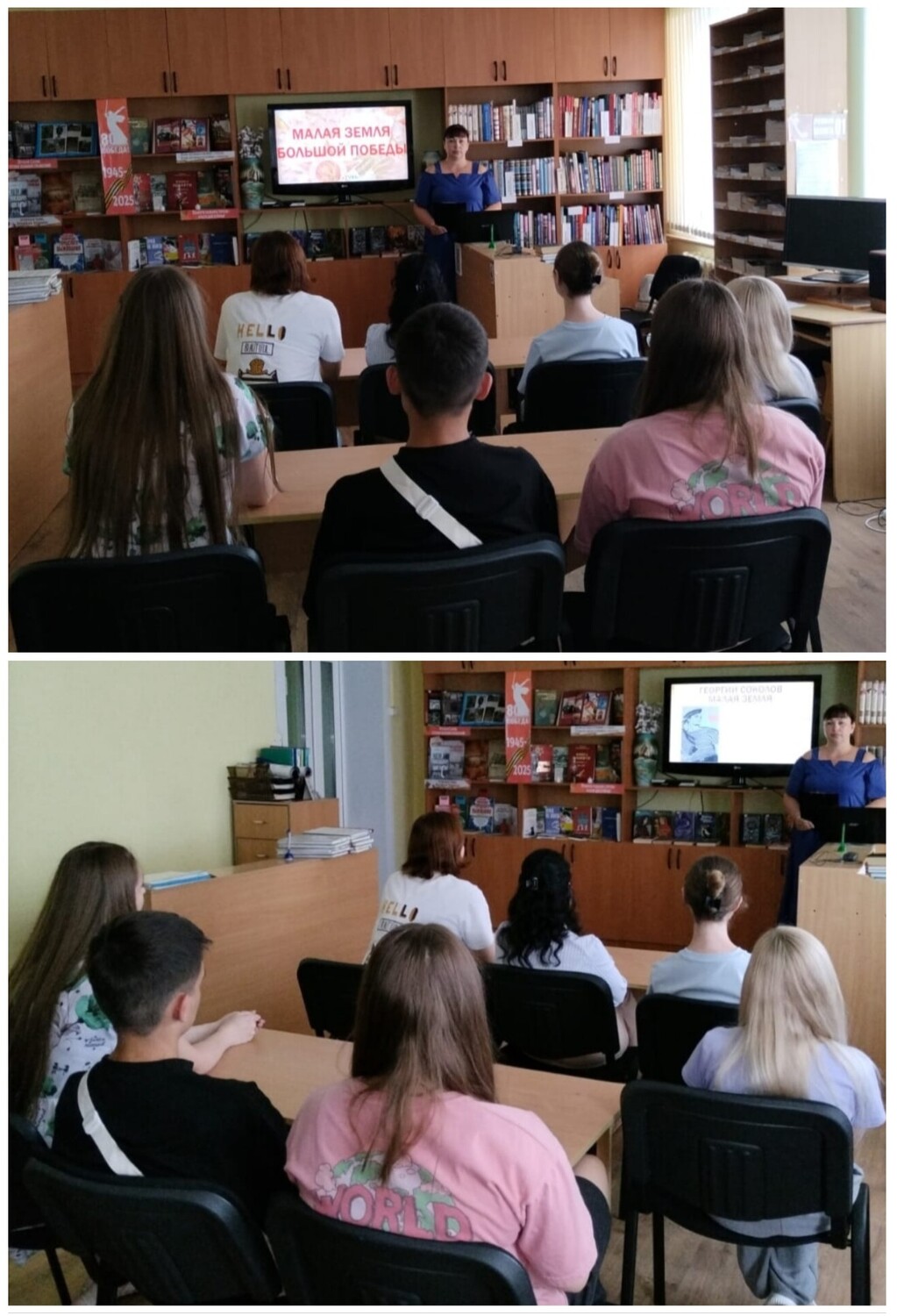 Центральным событием стало обсуждение книги Георгия Владимировича Соколова «Малая земля». Библиотекарь подробно рассказала о легендарной высадке десанта морской пехоты на Мысхако в 1943 году. Этот плацдарм, вошедший в историю как «Малая земля», стал символом беспримерной стойкости и самоотверженности советских воинов, которые, несмотря на непрекращающийся огонь противника, удерживали позиции, проявляя невероятное мужество.