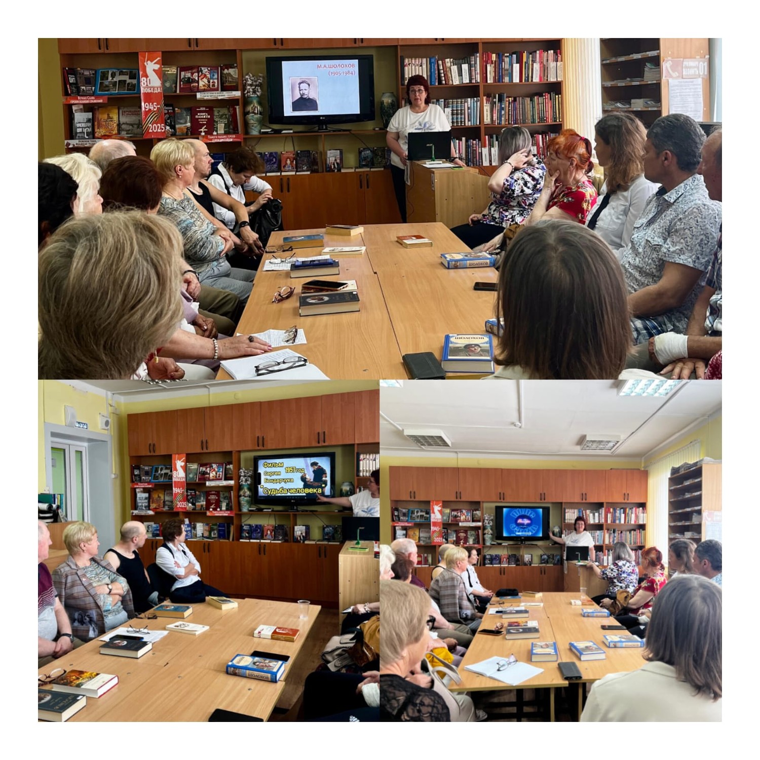 28 мая в рамках проекта «В гармонии с возрастом и снова Ретро в моде» для клуба «Встреча» была проведена литературная гостиная «Минувших лет живая память», библиотекарь рассказала об основных этапах жизни Шолохова, его детских годах, родителях, остановились на краткой характеристике произведений и истории их написания. Присутствующие играли в игру «Поле чудес» о жизни и творчестве писателя, а так же приняли участие в интеллектуальной игре по рассказу М. А. Шолохова «Судьба человека». Для наглядного восприятия произведений просмотрели кадры из художественных фильмов, снятых по мотивам книг Шолохова такие как «Поднятая целина», «Тихий Дон», «Судьба человека» и провели киновикторину по его рассказам. При дискуссии участники высказывали свои мысли и эмоции, связанные с рассказами писателя. Выразили восхищение храбростью и силой духа обычного русского солдата.