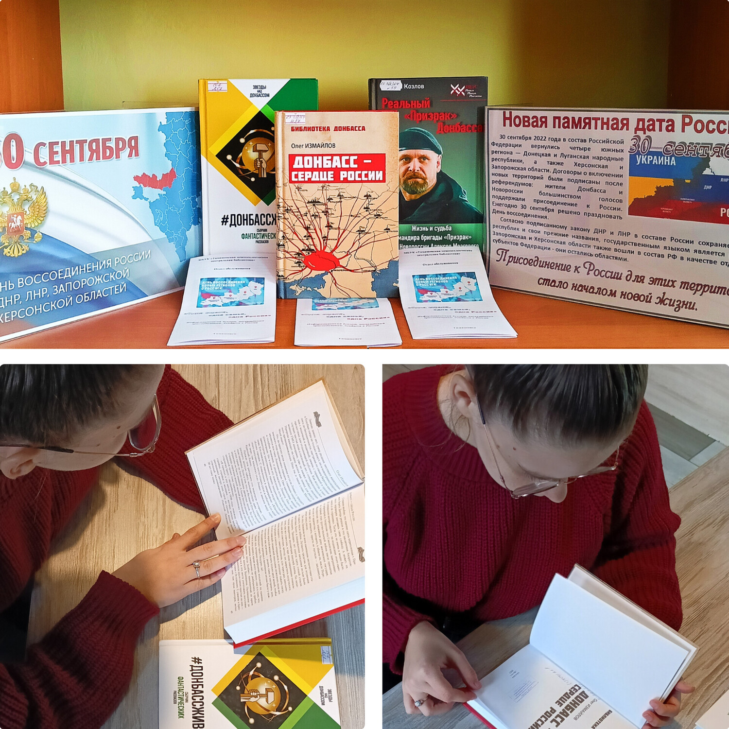 30 сентября в читальном зале Центральной районной библиотеки состоялась тематическая книжная выставка, приуроченная к новой, но глубоко значимой для всей страны памятной дате - Дню воссоединения Донецкой Народной Республики, Луганской Народной Республики, Запорожской и Херсонской областей с Российской Федерацией.
