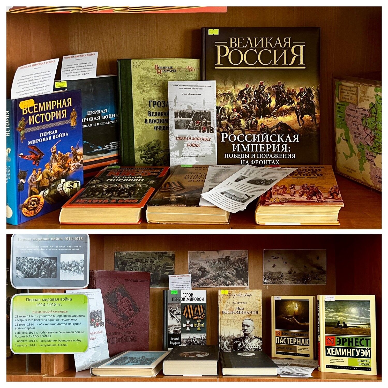 В читальном зале Центральной районной библиотеки подготовлена выставка – обзор книг. На ней представлены историко-документальные издания, посвящённые событиям тех лет. Книги рассказывают о причинах возникновения войны, о ходе боевых действий, об участии России в войне, героизме русских солдат и офицеров, о последствиях войны для нашей страны и мира. Материалы выставки направлены на возрождение памяти о Великой мировой войне, ее героях, о патриотизме русского народа, о его высоких моральных и духовных качествах.