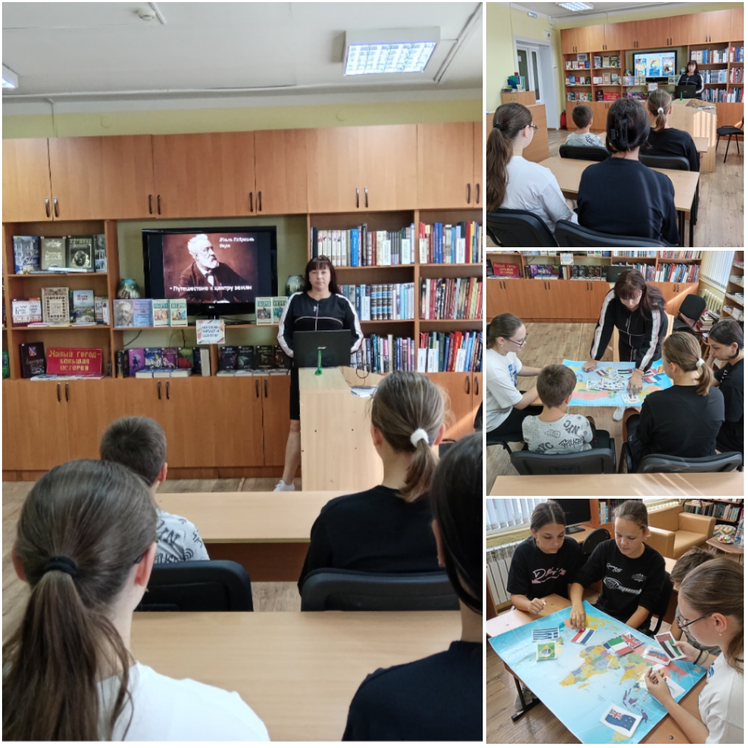 Проводя обзор книг, библиотекарь познакомила читателей с самыми известными и популярными романами Жюля Верна «Пятнадцатилетний капитан», «Таинственный остров», «Двадцать тысяч лье под водой. Посмотрели фрагменты фильма, «Путешествие к центру Земли», а также приняли участие в игре «Странствие по миру». Участвуя в небольшой викторине, ребята вспомнили морские термины и невероятные для времён писателя изобретения, которые придумал автор, и то, в каком виде некоторые из них дошли до наших дней.