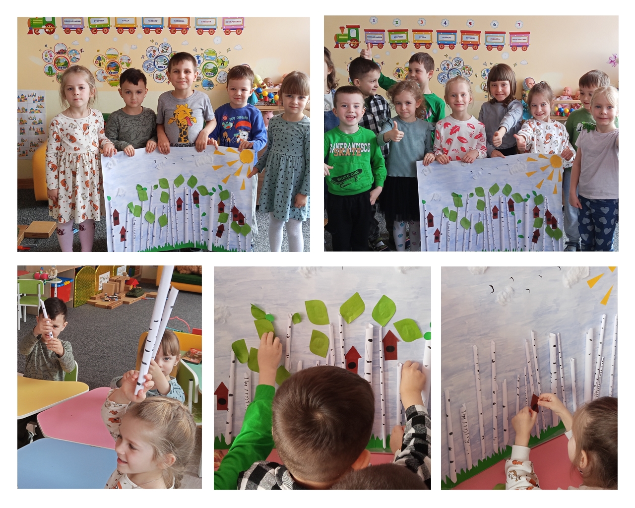 Завершающим этапом мероприятия стала творческая мастерская. Детям было предложено создать коллективную работу «Весна пришла». Красивые березки, выполненные руками детворы теперь украшают фойе садика, напоминая всем о прошедшем занятии и создавая весеннее настроение.