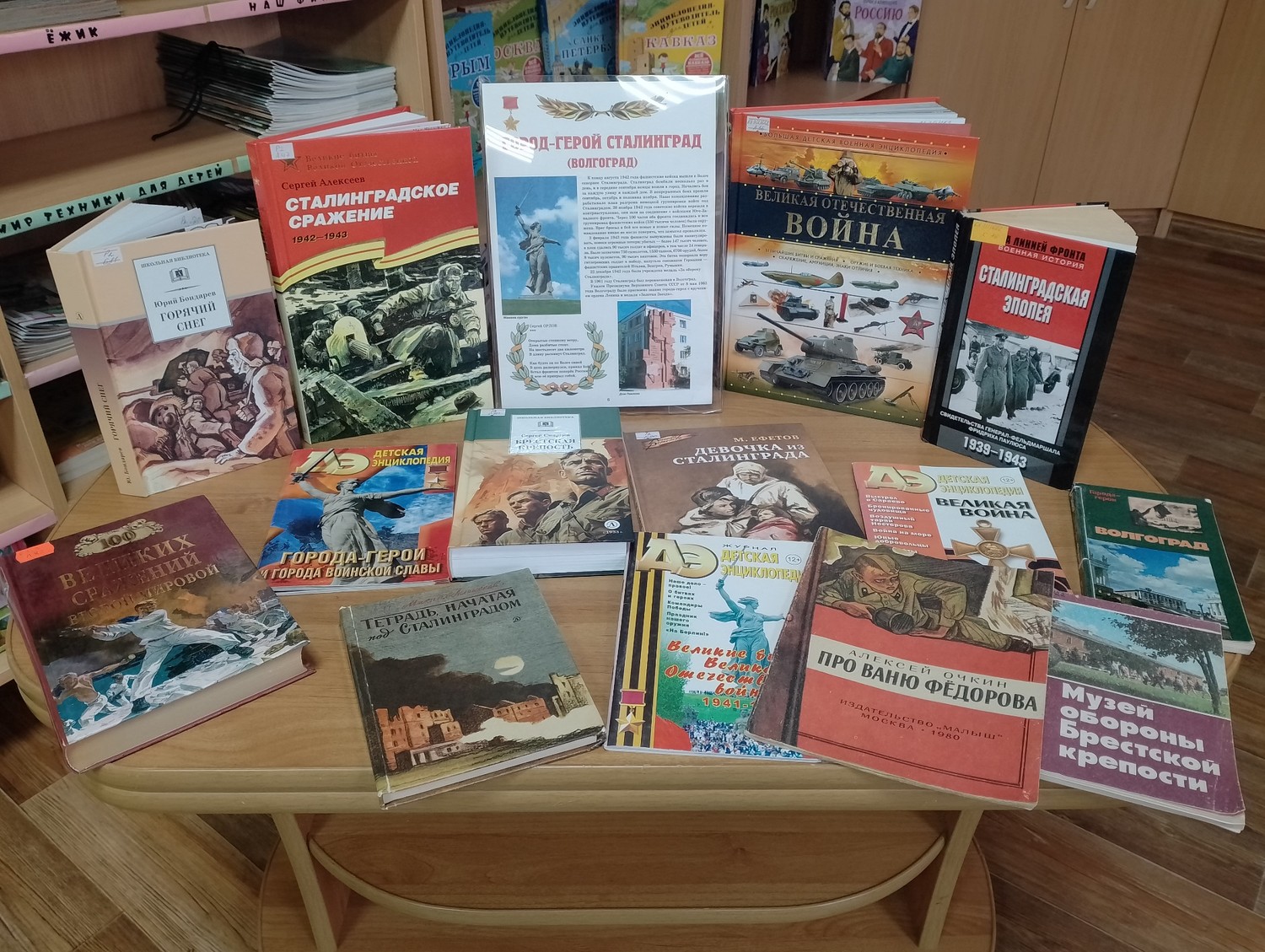 Вниманию ребят был проведен обзор книжной выставки. Библиотекарь посоветовал учащимся художественные произведения, в которых глубоко раскрыт подвиг солдат, сила, мужество и стойкость Сталинградцев.