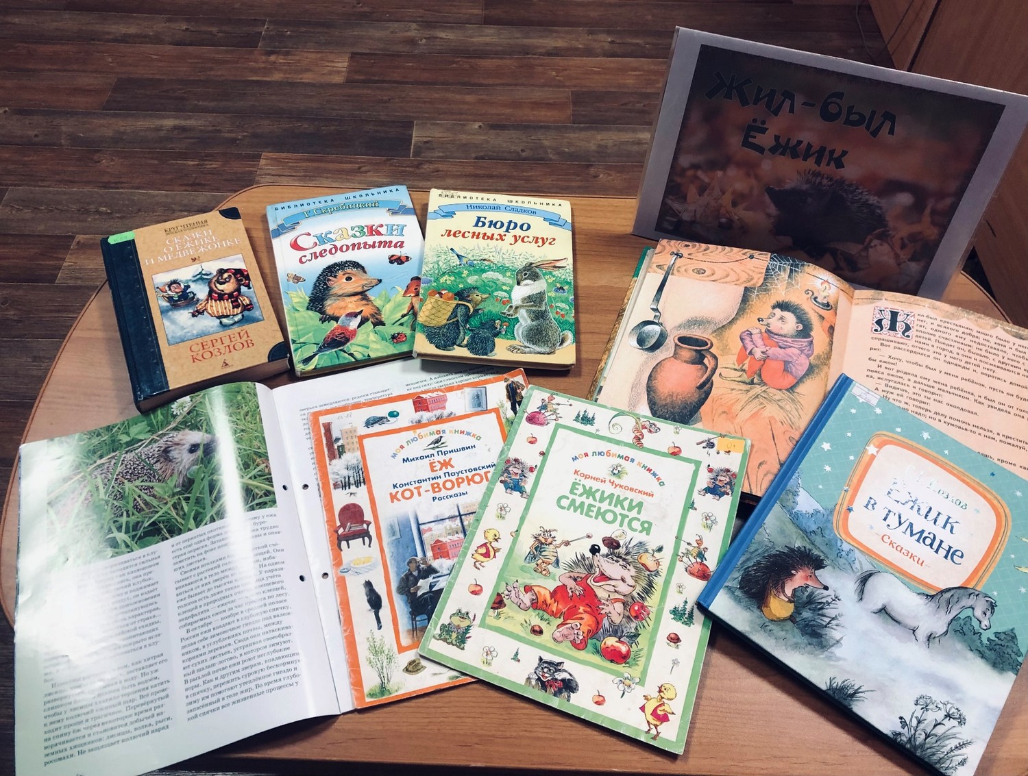 Вниманию участников клуба была предложена книжная выставка художественной литературы и научных статей о ежах. Библиотекарь рассказала ребятам о некоторых книгах, представленных на выставке. Это «Палочка-выручалочка», «Разные колеса», «Яблоко» В.Г. Сутеева; «Ёжик в тумане», «Трям! Здравствуйте!», «Зимняя сказка» Сергея Козлова; «Жили-были ежики» Андрея Усачева.
